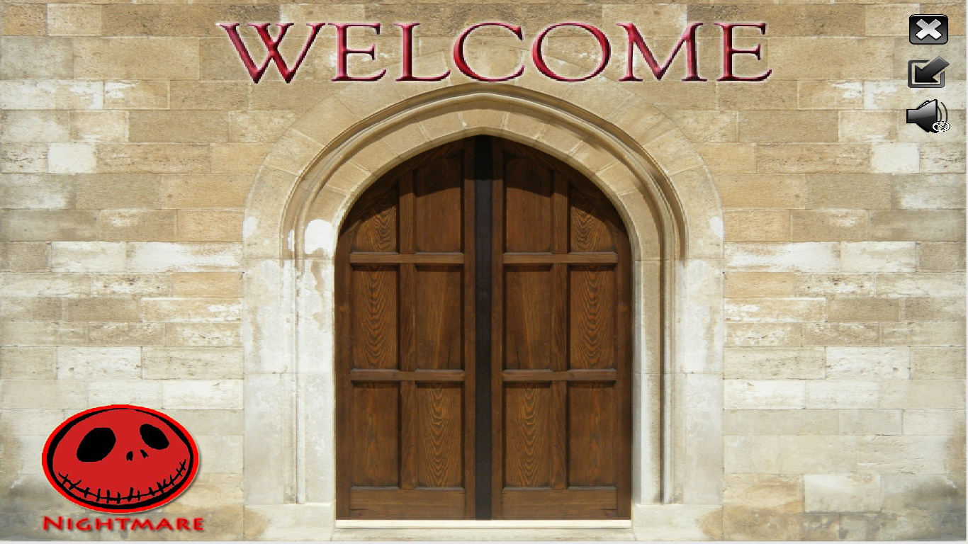 [1] Gambar diatas adalah bagian awal dari aplikasi Nightmare. Ketika user melakukan klik pada logo Nightmare, maka user akan masuk ke bagian credits. Logo Nightmare tidak hanya ada di bagian ini, namun ada di bagian lain dan akan memberikan akses yang sama juga (ke bagian credits). Ketika pintu di-klik, maka user akan masuk ke bagian selanjutnya.