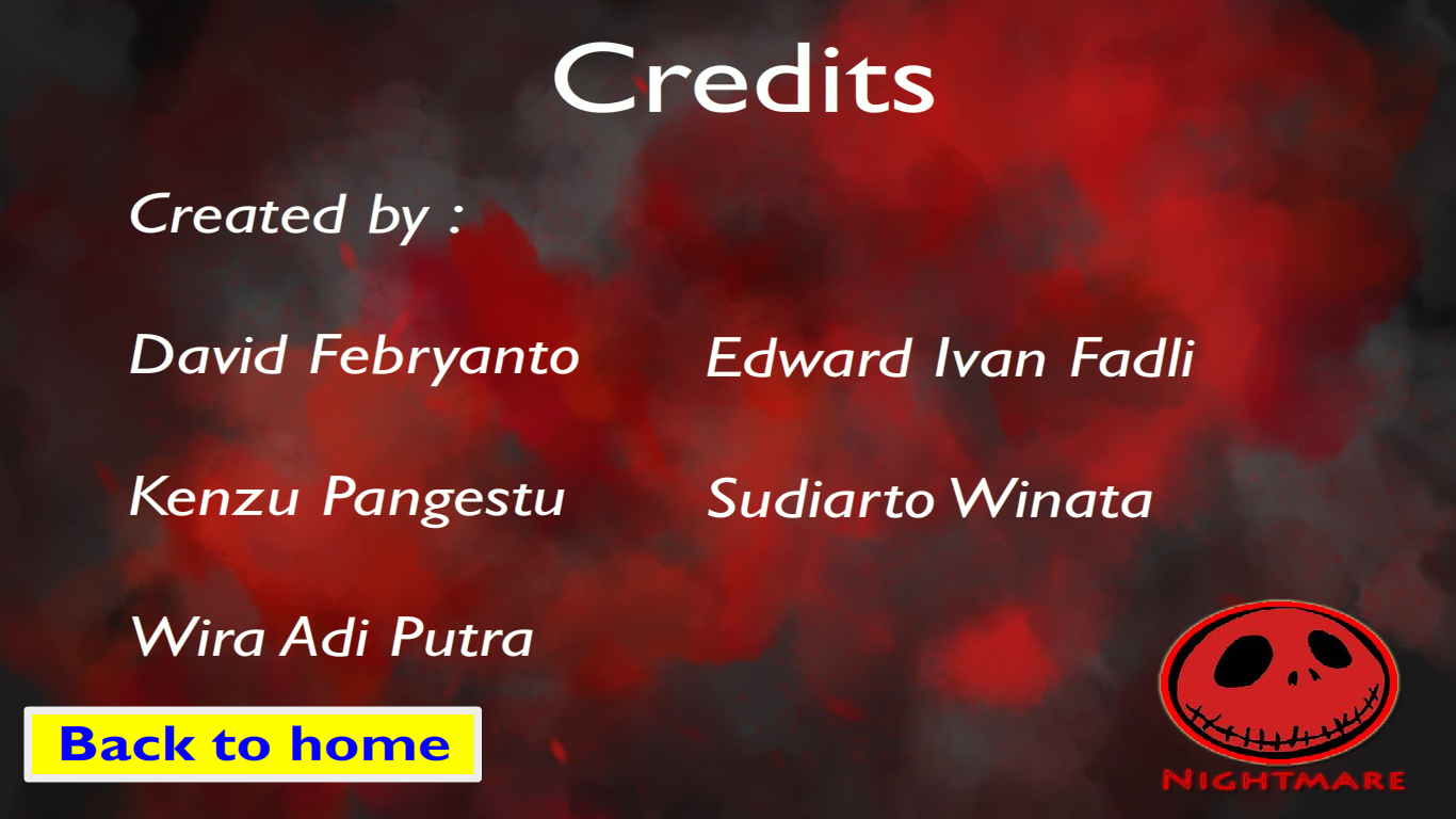 [2] Gambar diatas adalah bagian credits ketika logo Nightmare di-klik. Pada bagian Credits ini terdapat nama-nama anggota kelompok pembuat aplikasi Nightmare ini. User dapat meng-klik Back to home apabila ingin kembali lagi ke halaman utama.
