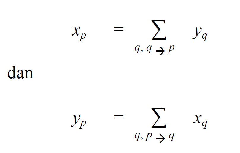 yang dalam hal ini nilai xp diperoleh dari jumlah seluruh nilai yq di mana q adalah situs-situs yang menunjuk (mengandung hyperlink) ke situs p (notasi q p menunjukkan bahwa q menunjuk ke p). Sementara nilai yp diperoleh dari jumlah seluruh nilai xq. Dari operasi tersebut, dapat dilihat bahwa antara hubs dan authorities terdapat sebuah hubungan yang saling memperkuat satu sama lain, yaitu: sebuah hub yang bagus menunjuk ke banyak authorities yang juga bagus, sementara sebuah authority yang bagus ditunjuk oleh banyak hubs yang juga bagus.