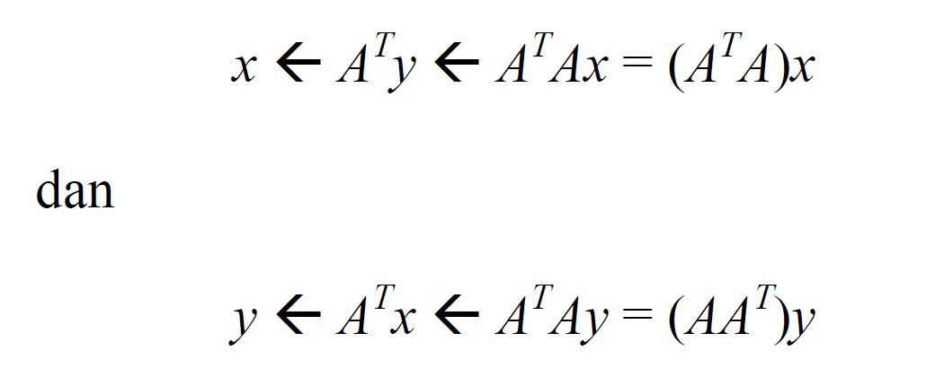 langkah 4: Buat matriks ketetanggaan A yang berukuran n x n dan juga matriks transposnya AT. Normalisasikan vektor eigen ε1 dari ATA yang bersesuaian dengan nilai eigen λ1 terbesar.