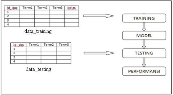 Tahap terakhir adalah tahap pengujian yang akan memberikan kelas pada data testing dengan menggunakan model yang telah dibangun pada tahap training. Tujuan dilakukan testing adalah untuk mengetahui performansi dari model yang telah dibentuk. Dengan beberapa parameter pengukuran yaitu akurasi, precision, recall, dan f-measure.
